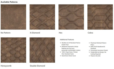 Tell those old and boring seats goodbye and say hello to the new and improved MODZ FS1! Upgrade your golf cart seats in both comfort and style, thanks to 100% virgin foam and hand-sewn details. Choose a base color, stitch pattern and accent piping for a one-of-a-kind look! And don't worry about fading or cracking, with high quality marine-grade vinyl these golf cart seats aren’t just luxurious but highly durable, too. See below for details: