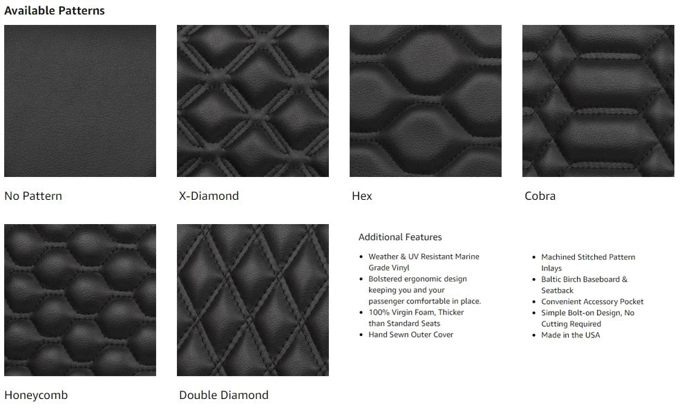 Say hello to the new and improved MODZ RC! Choose a base color, stitch pattern and accent piping for a one-of-a-kind look! And don’t worry about fading or cracking, with high quality marine-grade vinyl these golf cart seats aren’t just luxurious but highly durable, too. See below for details:
